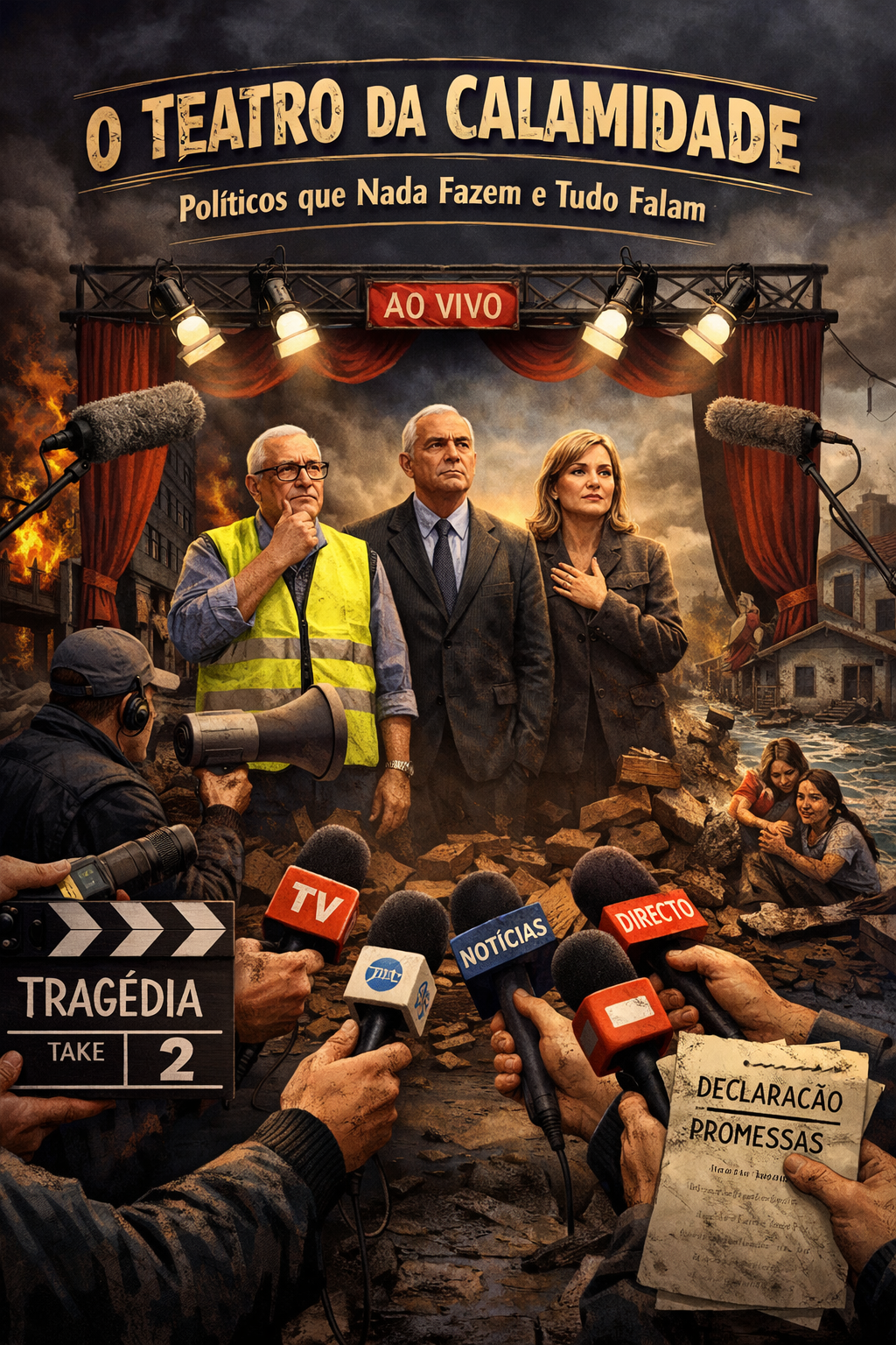 BOX DE FACTOS Tragédias nacionais transformadas em palco mediático. Políticos surgem em visitas coreografadas sem consequências práticas. Jornalismo reduzido a acompanhamento cerimonial do poder. Ausência total de responsabilização técnica e política. O povo serve apenas como figurante silencioso. O Teatro da Calamidade Políticos que Nada Fazem e Tudo Falam Quando o país arde, afunda ou colapsa, não surgem soluções — surgem comitivas. Não aparecem técnicos — aparecem câmaras. E onde devia haver acção, instala-se a encenação. 0 Portugal descobriu uma nova arte performativa: o teatro da calamidade. É uma peça repetida vezes sem conta, com elenco fixo, falas previsíveis e final conhecido — nada muda. O guião é simples. Há…