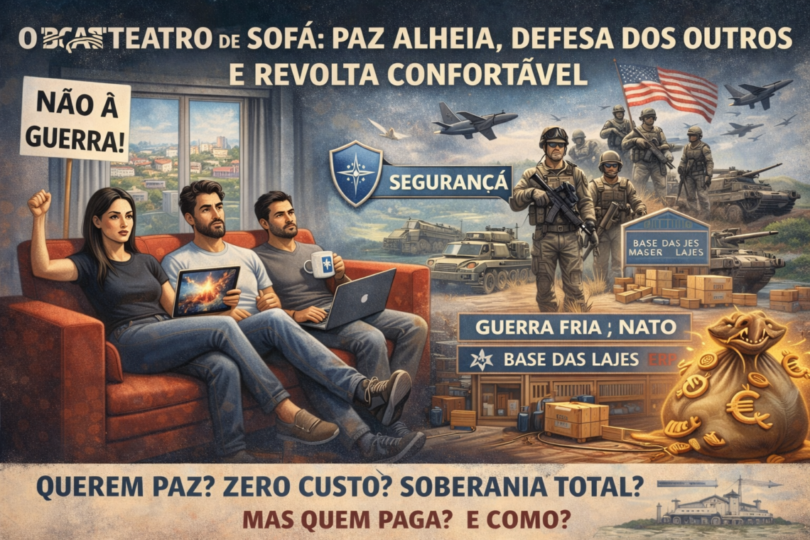 BOX DE FACTOS Segurança não é um estado natural: é um projecto (com custos, alianças e riscos). Criticar alianças e bases militares pode ser legítimo — mas exige modelo alternativo credível. O pós-guerra europeu assentou em pilares concretos: recuperação económica (ERP/Plano Marshall), dissuasão e defesa colectiva (NATO/Artigo 5). O paradoxo do “teatro de sofá”: querer paz + soberania + neutralidade + custo zero. Sem resposta à pergunta “quem paga e como?”, fica apenas o slogan. O Teatro de Sofá A Paz Alheia, a Defesa dos Outros e a Revolta Confortável Há uma indignação que nasce sem suor: a indignação do conforto. Exige paz, condena a defesa, e vive como se…