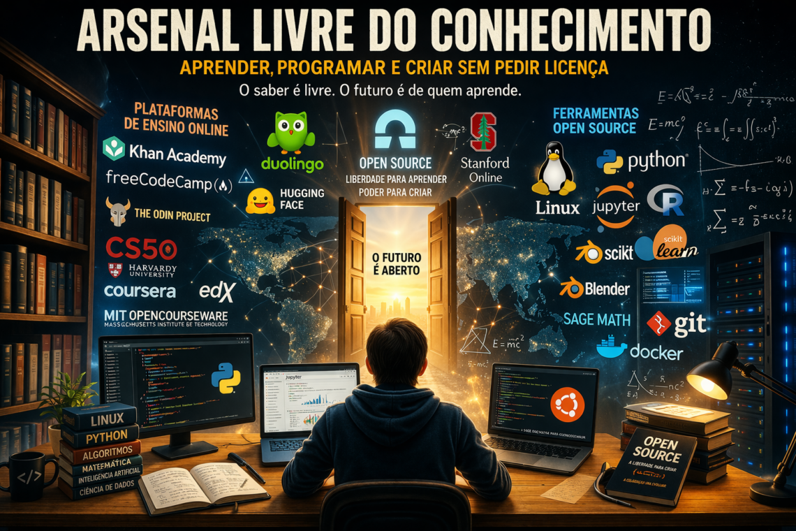 A lista seguinte foi organizada para servir o público em geral: estudantes, autodidactas, curiosos, professores, profissionais em reciclagem e cidadãos que simplesmente se recusam a envelhecer intelectualmente. Uns recursos são inteiramente gratuitos. Outros têm acesso gratuito ao conteúdo, mas cobram certificados ou funcionalidades adicionais. E depois há um segundo universo, igualmente importante: o das ferramentas livres e open source, que permitem criar, ensinar, estudar, escrever e partilhar sem ficar preso às algemas do software proprietário.